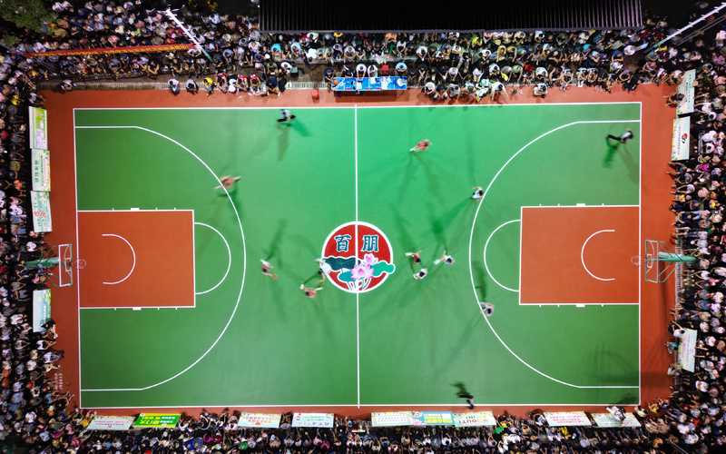 开幕仪式上,激昂的锣鼓声划破夜空,金红相间的舞狮队在高桩上辗转腾挪,最终于桩顶舒展“团结拼搏,永创辉煌”的醒目长联,掌声与欢呼声一浪高过一浪,点燃乡村体育盛宴第一把火。当晚,百朋镇与土博镇代表队的揭幕战正式打响,双方队员迅速进入状态,展开激烈角逐。场边助威氛围同样热烈,观众或攥拳呐喊,或跃起欢呼,心情随着攻防转换与比分起伏而激荡,现场热度持续攀升至顶峰。